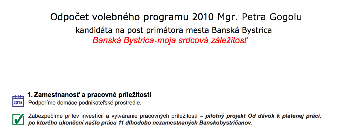 Vyhodnoteniu jeho sľubov z roku 2010 sa budeme podrobne venovať v samostnatnom článku. Zatiaľ však prinášame malú ochutnávku, v podobe toho, ako Peter Gogola hodnotí svoje plnenie sľubov v oblasti zamestnanosti. V roku 2010 Gogola okrem iného sľúbil, že ak bude primátorom mesta urobí nasledovné: