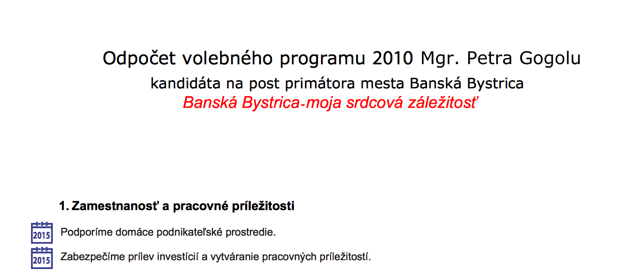 Tak ako je v predvolebnom čase zvykom, prichádza čas, keď noví kandidáti na poslancov a primátorov sľubujú a tí starí robia odpočty svojej doterajšej práce. Súčasný primátor Peter Gogola začal svoju kampaň nezvykle, miesto odpočtu svojej práce a vyhodnotenia sľubov z roku 2010, začal útočiť na protikandidátov. Po verejnej kritike sa však aj on odhodlal a nakoniec predložil odpočet plnenia svojho programu s ktorým sa uchádzal o dôveru Banskobystričanov pred štyrmi rokmi.