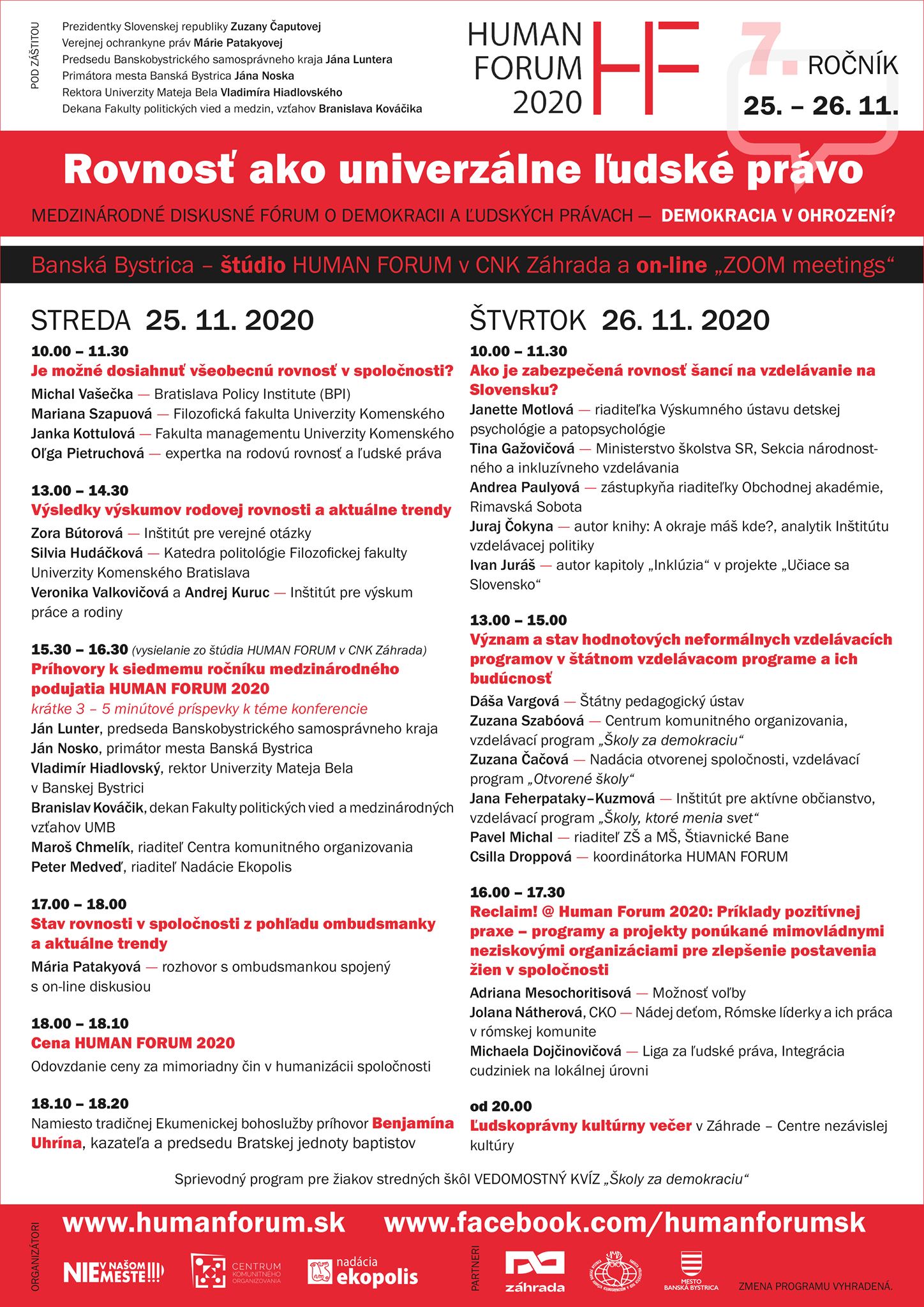 Pod záštitou prezidentky Slovenskej republiky Zuzany Čaputovej, verejnej ochrankyne práv Márie Patakyovej, predsedu Banskobystrického samosprávneho kraja Jána Luntera aj primátora mesta Banská Bystrica Jána Noska sa 25. a 26. novembra 2020 uskutoční siedmy ročník medzinárodného diskusného fóra o ľudských právach HUMAN FORUM – Demokracia v ohrození?