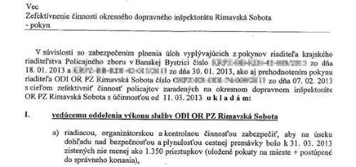 Dopravných policajtov v Rimavskej Sobote nedávno vystavil na smiech celému Slovensku ich okresný šéf, ktorý im stanovil mesačný limit vybraných pokút. Miesto „pomáhať a chrániť“ občanom sa dopraváci zo dňa na deň stali takpovediac „vypaľovačmi“. Stačil jeden primitívny príkaz ich šéfa: „Riadiacou, organizátorskou a kontrolnou činnosťou zabezpečiť, aby na úseku dohľadu nad bezpečnosťou a plynulosťou cestnej premávky bolo k 31.03. 2013 zistených nie menej ako 1350 priestupkov.“ Darmo, papier nepustí…