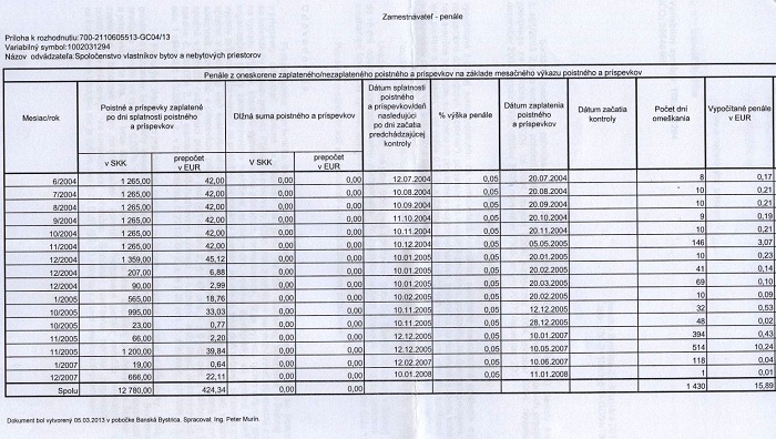 Sociálna poisťovne zaslala Spoločenstvu vlastníkov bytov koncom februára 2013 rozhodnutie o vyrúbení penále v celkovej výške 15,89 eura za oneskorené platby odvodov v rokoch 2004-2007 (pri sadzbe 0,05% za deň). Pretože vypočítaná dlžná čiastka penále za kontrolované obdobie cca 9 rokov presiahla zákonom stanovenú hodnotu 3,32 eura, musela ju Sociálna poisťovňa predpísať.