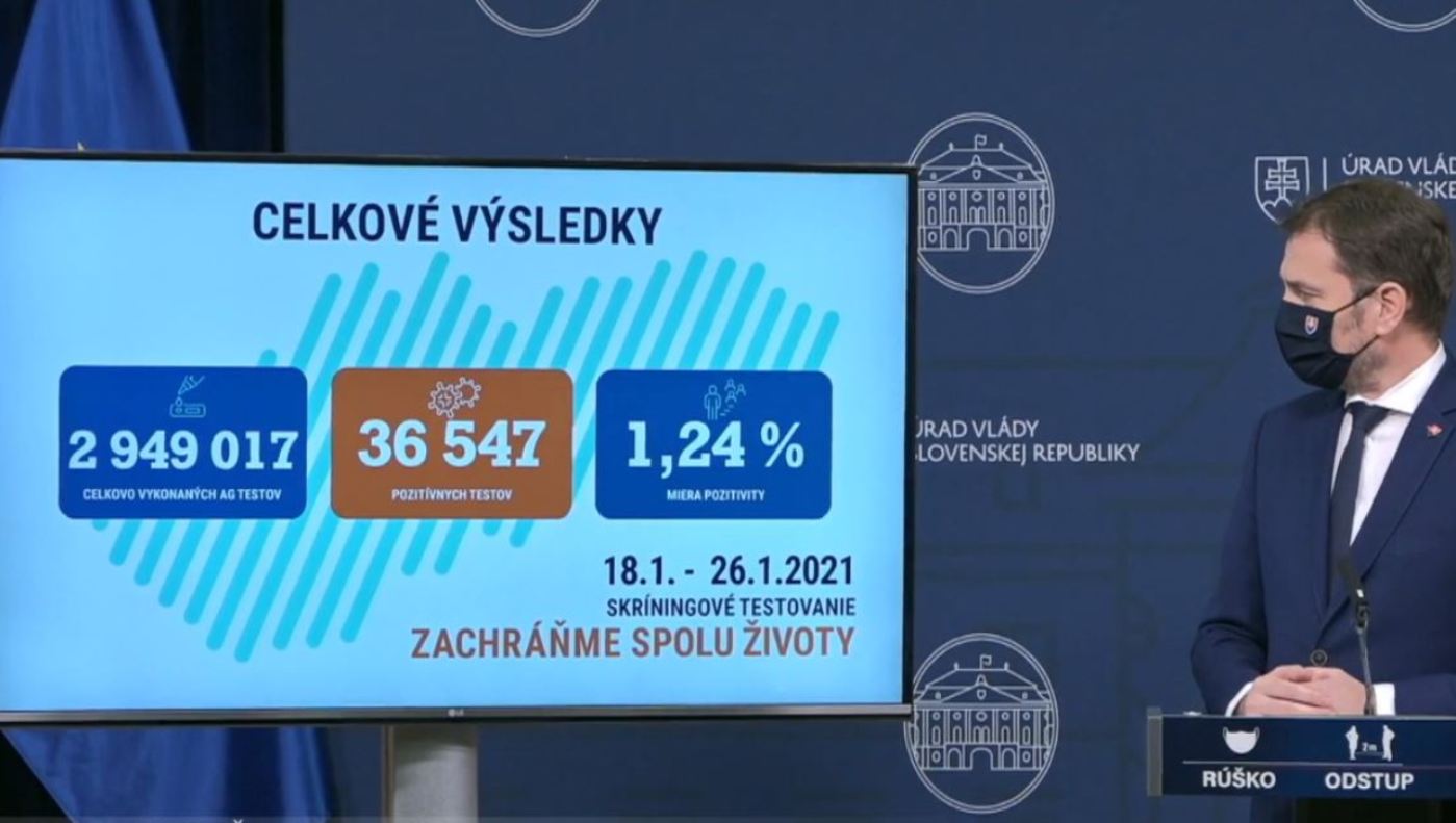 V stredu premiér Igor Matovič zverejnil celkové výsledky prvého kola celoplošného testovania na Slovensku, ktoré sa konalo od 18. – 26. januára 2021. Tie sa v niektorých značne líšili od predtým ohlasovaných priebežných, z čoho obvinil analytikov, ktorí však pracovali len s údajmi od štátnych inštitúcií. Do prvého kola celoplošného testovania na ochorenie COVID-19 sa zapojilo 2 949 017 ľudí. Pozitívny výsledok malo 36 547 z nich, čo predstavuje pozitivitu 1,24 percenta.