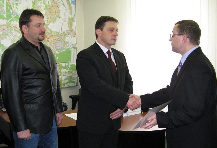 Náčelník MsP Ľubomír Piterka preberá za účasti primátora Gogolu certifikát od riaditeľa mediačno-konzultačného centra Sova, Martina Dubníčka.