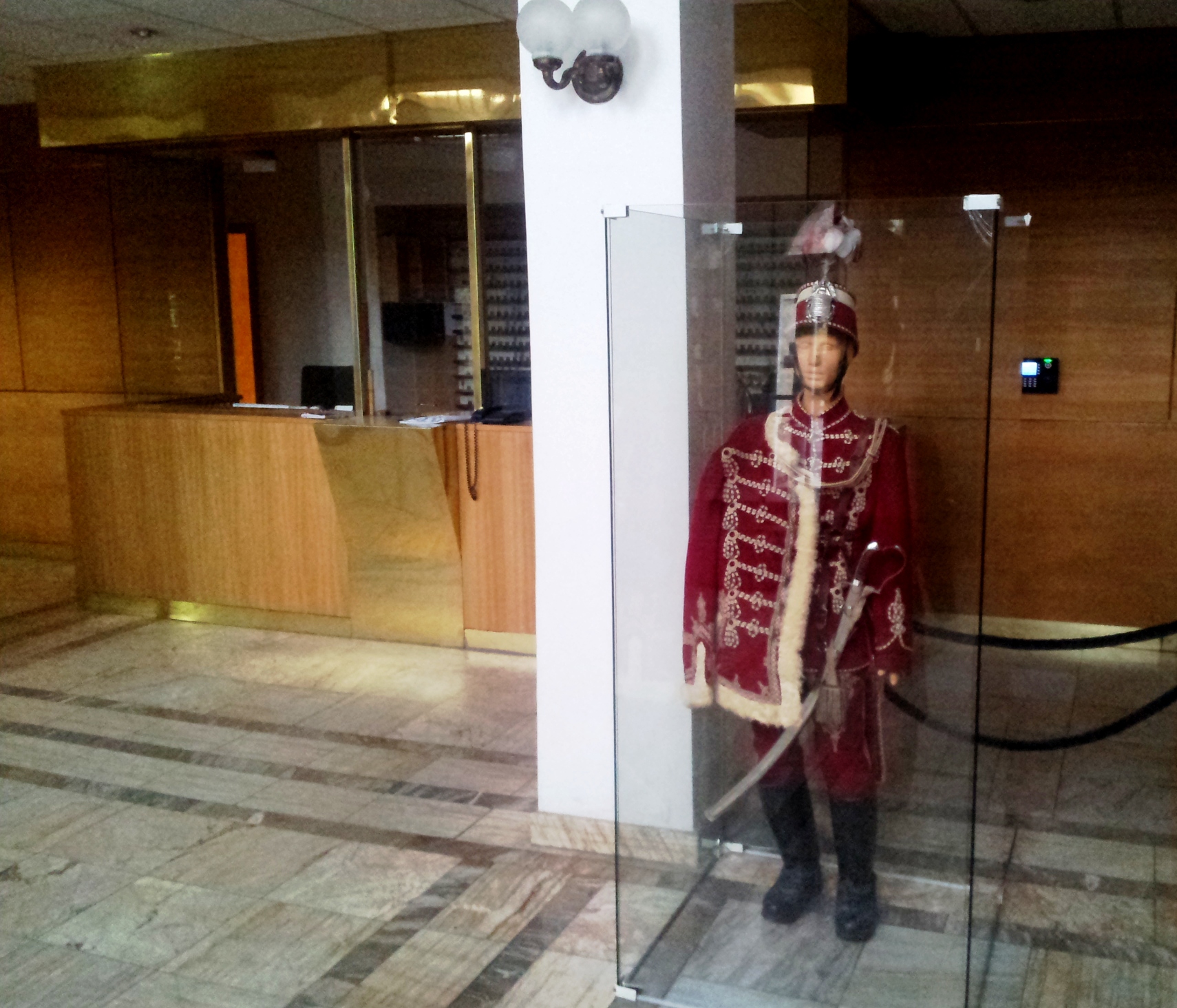 Po čase sa objavil pred recepciou na MsÚ predsa len objavil mestský policajt v krásnej tmavočervenej rovnošate z 19.storočia. Aby nedošlo k jeho poškodeniu, stojí majestátne v sklenenej vitríne, ktorú chráni kamerový systém. Napokon sme zistili, že sa jedná o figurínu vypožičanú spolu s ďalšími dobovými exponátmi zo Stredoslovenského múzea a archívu, ktoré si môžu návštevníci pozrieť v vestibule vchodu do budovy banskobystrického MsÚ.
