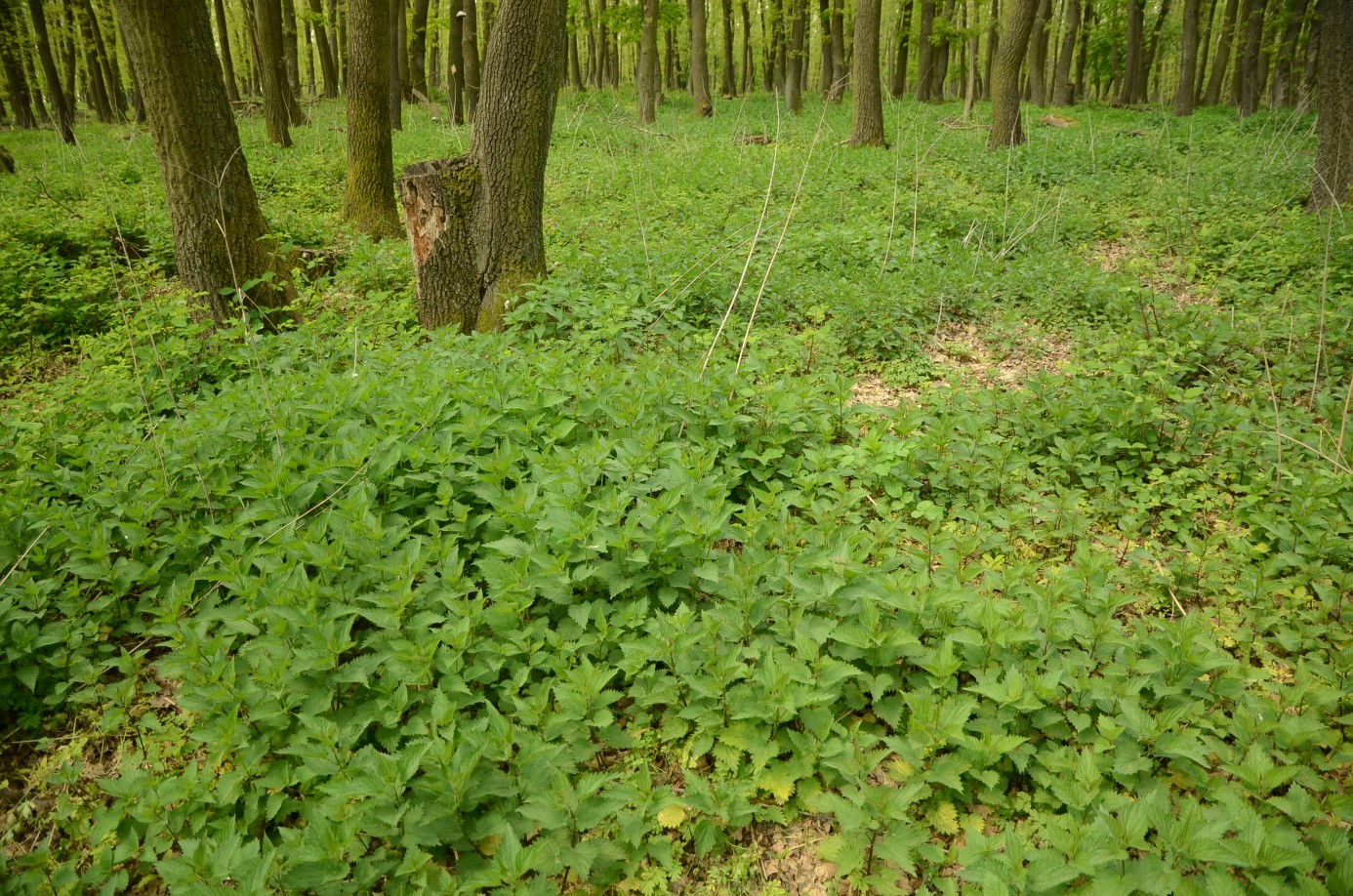 Obr. 1: V dôsledku obohacovania lesného prostredia dusíkom sa rozširuje len niekoľko druhov rastlín, ktoré vytláčajú ostatné a spôsobujú tak pokles biodiverzity lesov. Na fotografii pŕhľava dvojdomá, na živiny a dusík náročná rastlina, ktorá získala absolútnu prevahu v druhovom zložení dubového lesa na južnom Slovensku. ©František Máliš