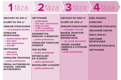 Prvá fáza otvárania prevádzok sa spustí od stredy 22. apríla. Otvoria sa v nej obchody a služby do 300 m2, prevádzky verejného stravovania cez predajné okienko, vonkajšie športoviská za stanovených podmienok, ubytovacie prevádzky na dlhodobé ubytovanie, vonkajšie trhoviská za presne stanovených podmienok, predaj automobilov a autobazáry.