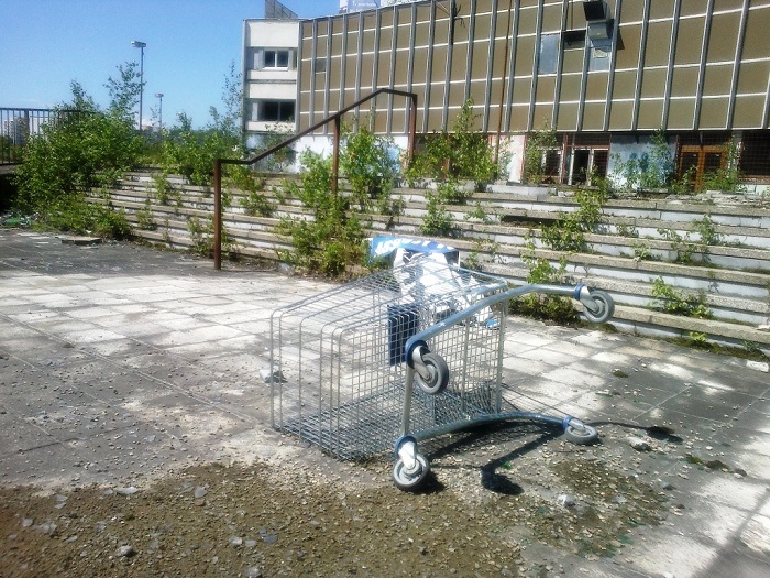 Na terasu objektu sme sa cez dieru v oplotení schodiska dostali aj teraz, ale do vnútra bývalého Tesca už nie. Rozbité vstupné dvere niekto zabezpečil reťazami a zámkami, takže aspoň do obrovských hál voľakedajšieho obchodného centra sa teraz nedá dostať.