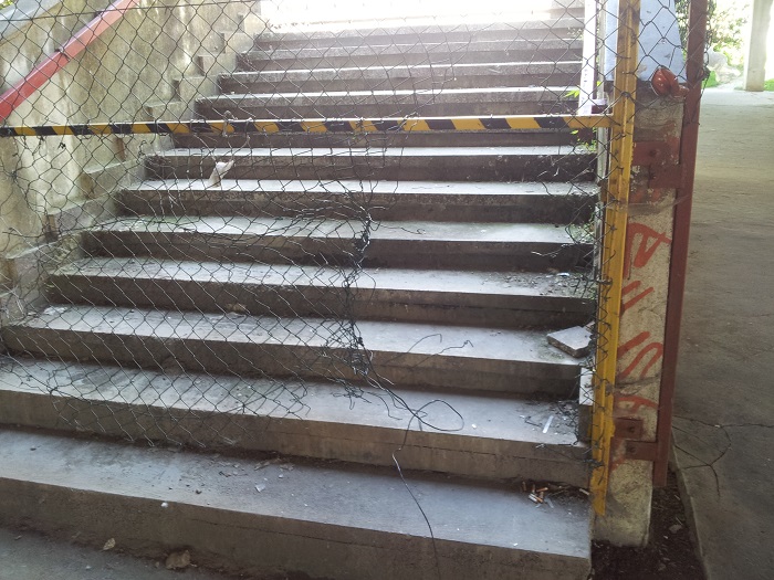 S rozbitou terasou sa však neurobilo nič. Po najbližších dažďoch sa tu zasa vytvorí vodné jazero, z ktorého cez škáry v paneloch a popri stĺpoch ťažkého skeletu bude ďalej pretekať voda, narúšajúca okrem betónu aj oceľové spoje nosnej konštrukcie, čo oslabuje statiku terasy…