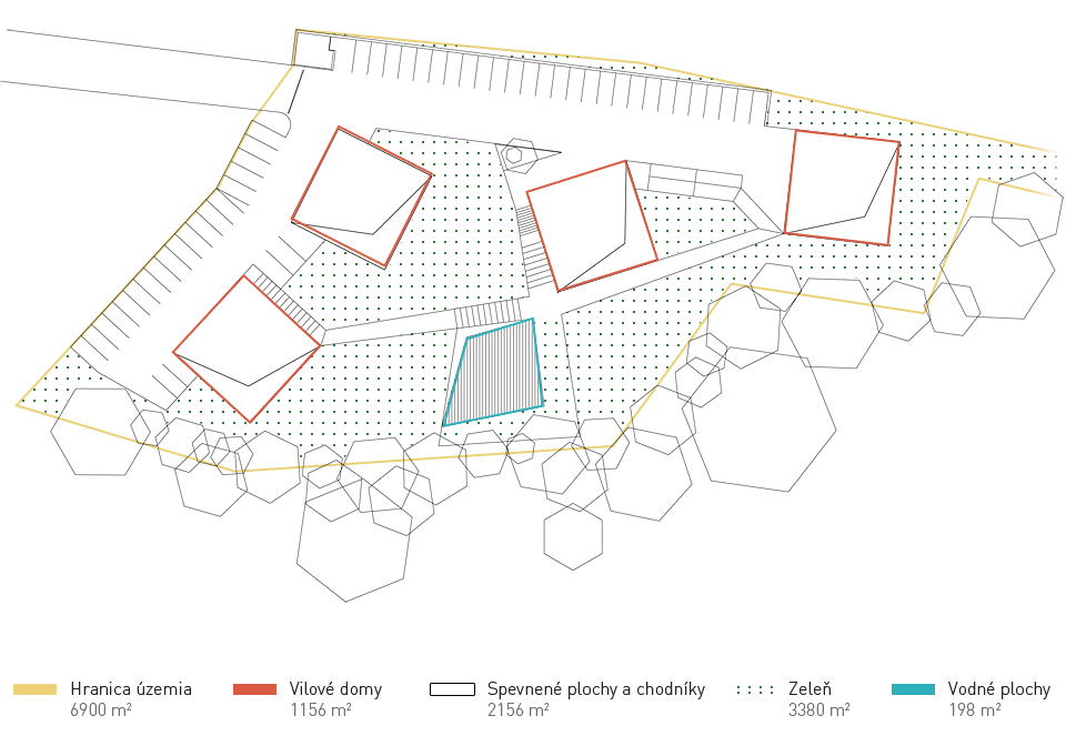 „Veríme, že sme našli dobrý pozemok Nie je to lokalita, ktorá by si zaslúžila ďalší panelák. Naším jediným zdôvodniteľným riešením boli mestské vily, ktoré dúfame, že budú v rezorte starnúť s nami. Citlivá kompozícia drevom maskovaných budov v členitom teréne nahráva pocitu, akoby tu tie vily stáli odjakživa.”