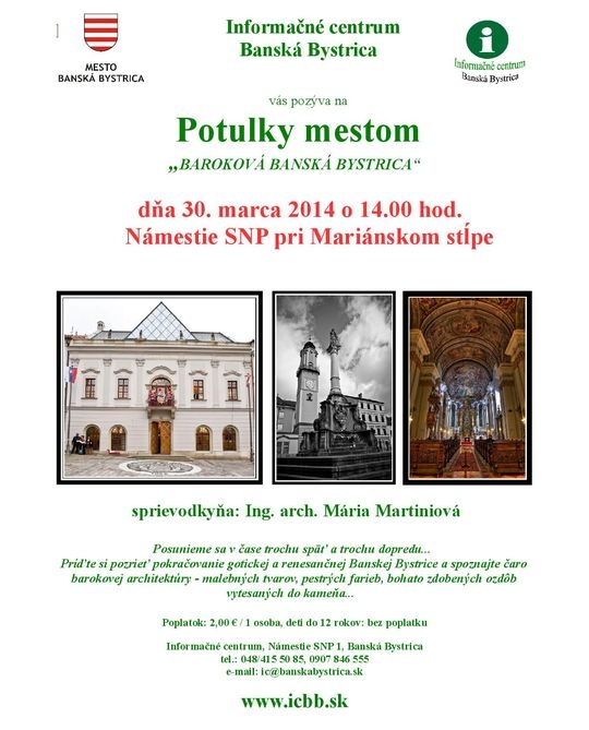 Stretnutie účastníkov prehliadky barokovej Banskej Bystrice je tradične pri Mariánskom stĺpe na Námestí SNP v nedeľu 30.marca 2014 o 14:00 hod. Sprievodkyňou bude Ing. arch. Mária Martíniová.
