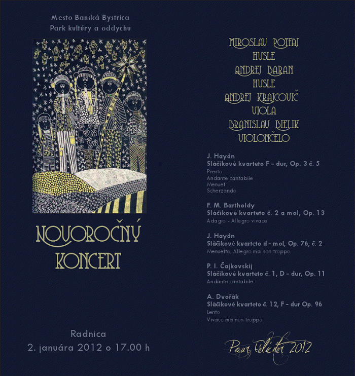 Organizátori Vás srdečne pozývajú na tento výnimočný koncert a želajú Vám v prvých dňoch nového roka hlboký umelecký zážitok.