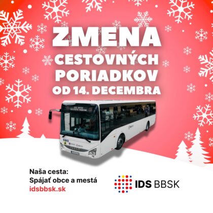 Už túto nedeľu, 14. decembra, vstúpi do platnosti celoštátna zmena cestovných poriadkov. Integrovaný dopravný systém Banskobystrického samosprávneho kraja (IDS BBSK) v spolupráci s dopravcami SAD Zvolen a SAD Lučenec pripravil pre cestujúcich viaceré novinky, zmeny v cestovných poriadkoch tiež reagujú na upravený grafikon železníc.