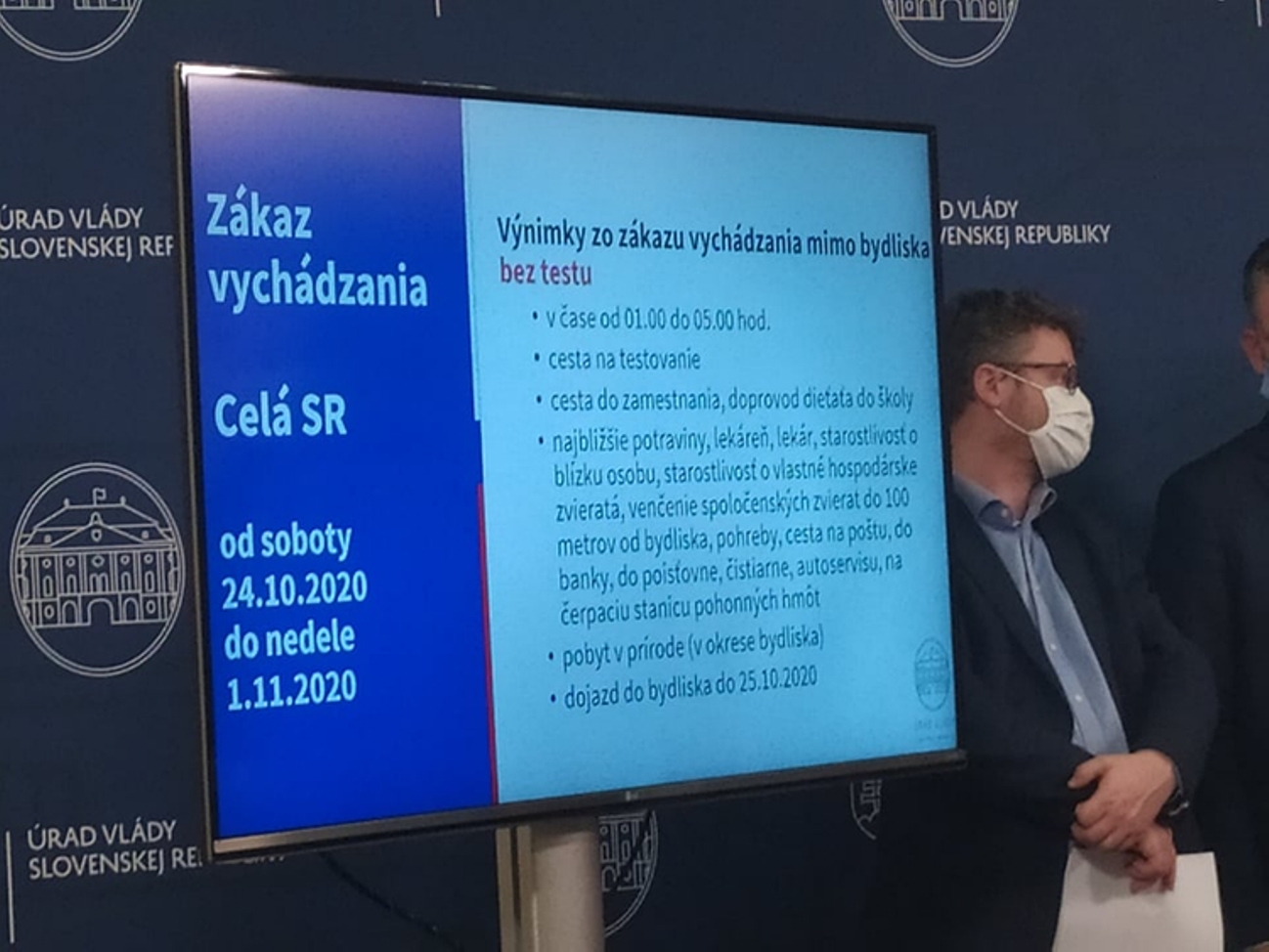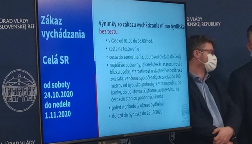Zákaz vychádzania od soboty do 1. novembra bude platiť aj pre celé Slovensko, s výnimkou ciest na testovanie, do práce a zabezpečenia nevyhnutných potrieb či pobyt v prírode v okrese bydliska. Vláda síce de jure nezatvára obchody, ale zákazom vychádzania okrem potravín či drogérií to de facto vlastne urobila, bez odškodnenia obchodníkov. Rovnako sa vláda vysporiadala s tým, ako donútiť ľudí bez príkazu prísť sa otestovať, pretože inak musia zostať v 10 – dňovej domácej karanténe pod hrozbou sankcie.