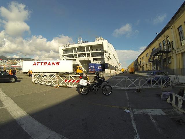 Vybavenie formalít a nalodenie trvalo presne sedem minút, z toho som päť minút šliapala po schodoch. Všetci mali dobrú náladu a tak som sa ocitla v útrobách obrovského monštra skôr, ako by som sa nazdala.  Nikdy som nevidela také obrovské šrauby, ako tie, ktoré spájali jednotlivé časti trajektu. Hoci  možno to bolo iba preto, že som predtým  netrpela motoristickou úchylkou a nesledovala veľkosť matiek a šráub. Okrem priviazanej Euphorie (jednostopová kráska) a jedného skútra, stálo pyšne pod plachtami aj veľké GSO. Ostatné miesta zaberali nenormálne expedičné autá.