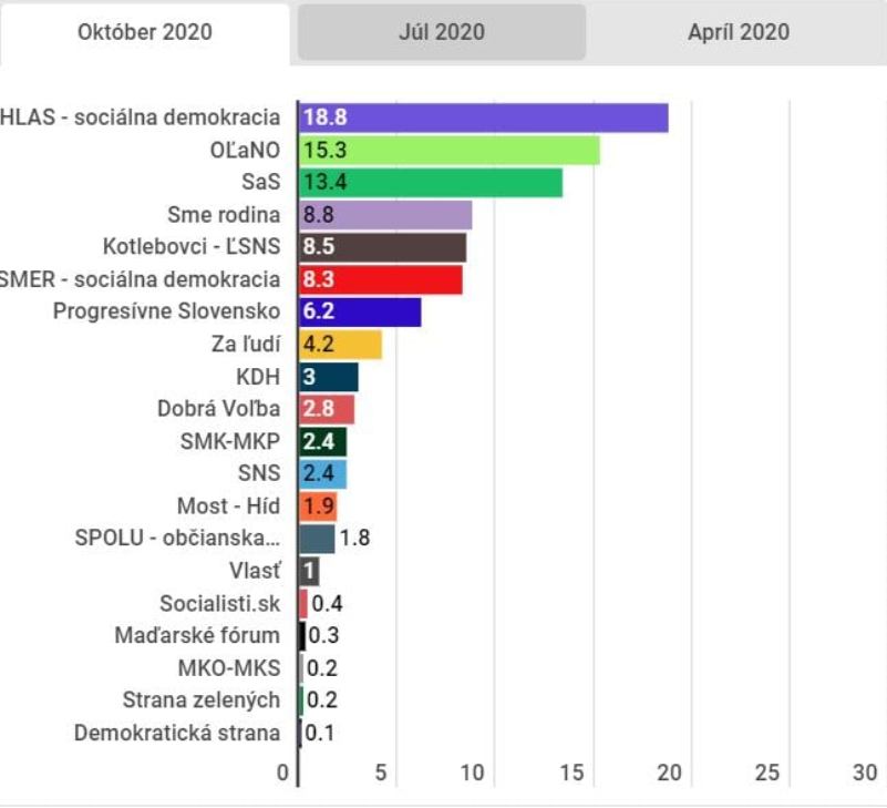 Doposiaľ vedúce hnutie Igora Matoviča OĽaNO na druhom mieste by získalo 15,3 percenta hlasov. Na treťom mieste skončila neustále rastúca strana Richarda Sulíka, ktorú by volilo 13,4 percenta respondentov.