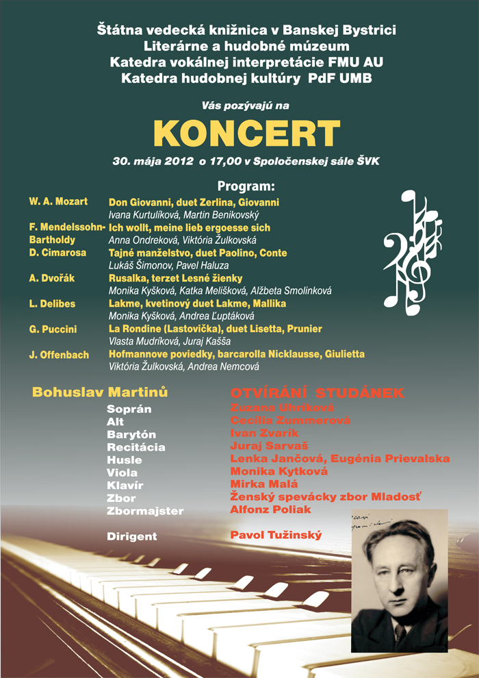 Štátna vedecká knižnica v spolupráci s Literárnym a hudobným múzeom, Katedrou vokálnej interpretácie FMU AU a Katedrou hudobnej kultúry PdF UMB , Vás pozývajú dňa 30.mája 2012 o 17:00 na koncert „OTVÍRANÍ STUDÁNEK“.