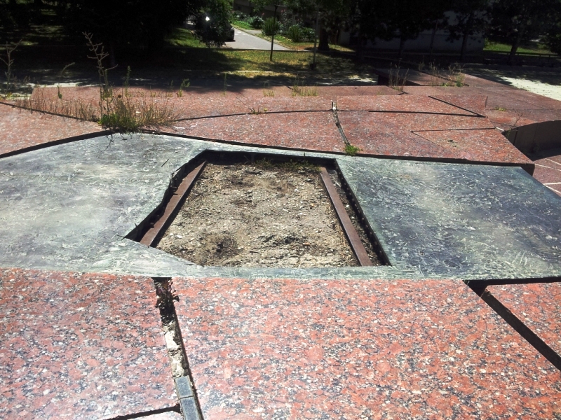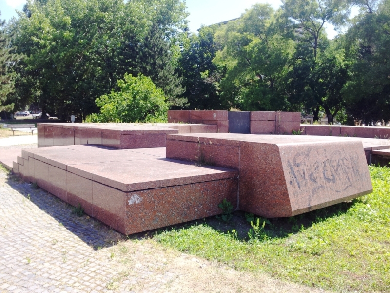 „Samotný podstavec je z mramoru, má hnedo-červenú farbu a pripomína mi zacelenú ranu alebo zaschnutú chrastu. U mňa tento dojem celkovo umocňuje aj samotné členenie a tvar podstavca, v strede ktorého je diera po odstránení propagandistického diela. Idea chrasty je pre mňa metaforou propagandistického, podotýkam zlého umenia, ktoré je podľa môjho názoru úrazom pre verejný priestor a po zmene politického režimu zase metaforicky odpadáva, podobne ako chrasta.“