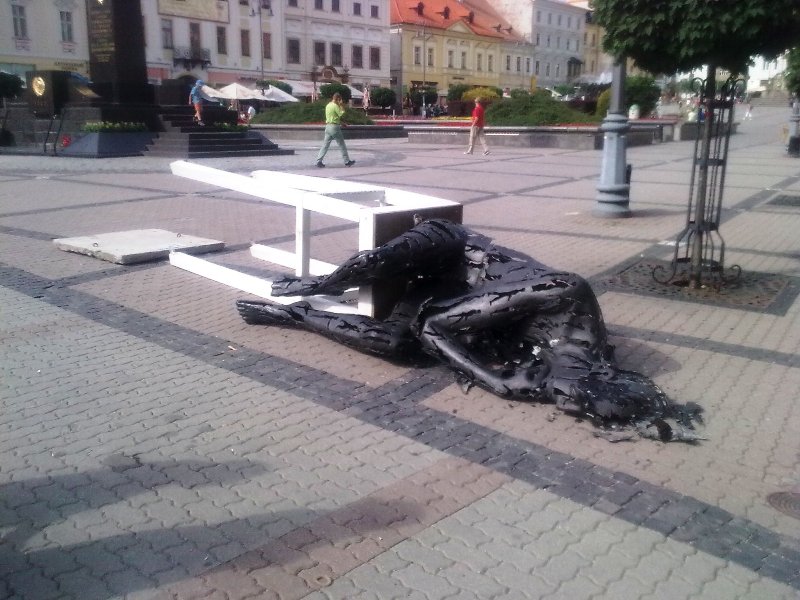 Neskôr ju vystriedala zvláštna drevená debna s názvom „Ukrytá socha“. Jej autorom bol český výtvarník Václav Magid s podtextom „Európou obchádza strašidlo…“ Potom na Námestí SNP vandali zničili outdoorové sochy „Humanoidov“ a „Mysliteľa“ českého umelca Michala Trpáka a v Banskej Bystrici bolo po výstave umeleckých diel pod holým nebom.