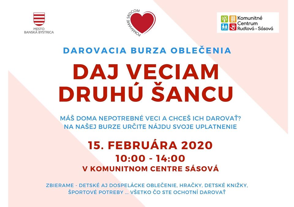 Následne v sobotu 15. februára 2020 od 10:00 – 14:00 hod. tu bude darovacia burza „Daj veciam druhú šancu“. Na ňu môžu prísť ľudia, ktorí takéto veci potrebujú a pomôžu im v ich každodennom živote.