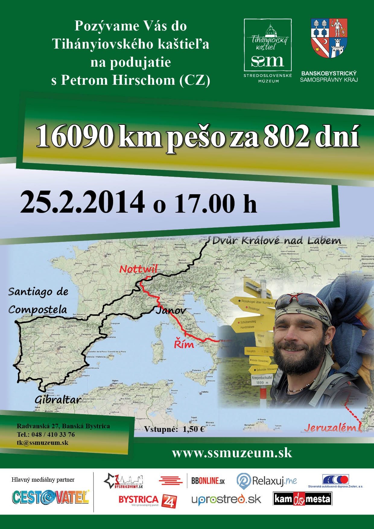 Stredoslovenské múzeum v Banskej Bystrici pripravilo už tento utorok o 17:00 hodine pre všetkých milovníkov dobrodružstva stretnutie s českým cestovateľom Petrom Hirschom. Pútnik, ako seba Hirsch nazýva, predstaví návštevníkom Tihányiovského kaštieľa svoju viac ako 16-tisíc kilometrov dlhú cestu, ktorú prešiel pešo za 802 dní.