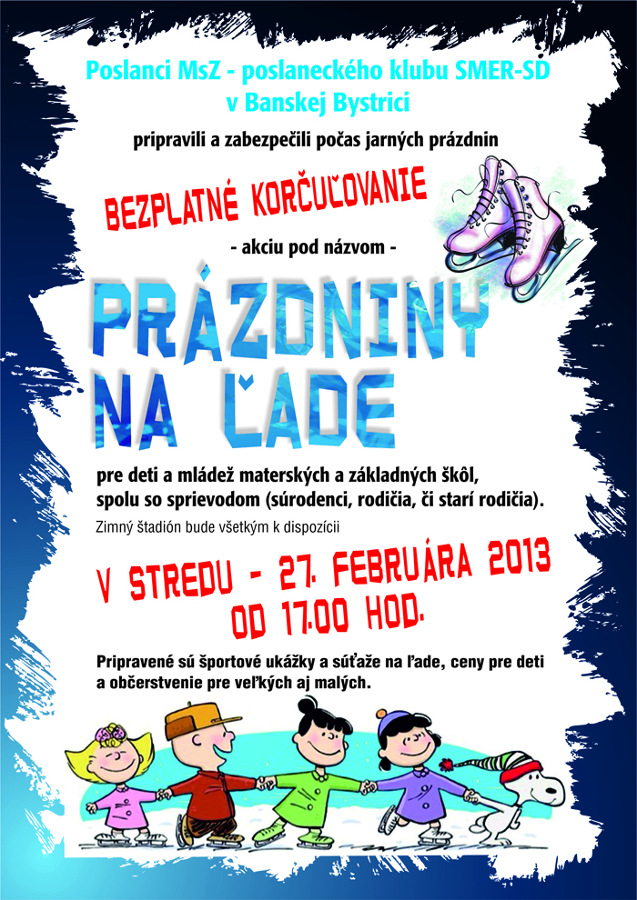Akciu „Prázdniny na ľade“ pre deti a mládež materských a základných škôl, spolu so sprievodom (súrodenci, rodičia či starí rodičia), pripravili a zabezpečili na stredu 27.februára 2013 od 17:00 hod. poslanci mestského zastupiteľstva z poslaneckého klubu SMER-SD. Zimný štadión bude všetkým k dispozícii bezplatne. Okrem korčuľovania sú pripravené aj športové ukážky a súťaže na ľade, ceny pre deti a občerstvenie pre veľkých i malých.