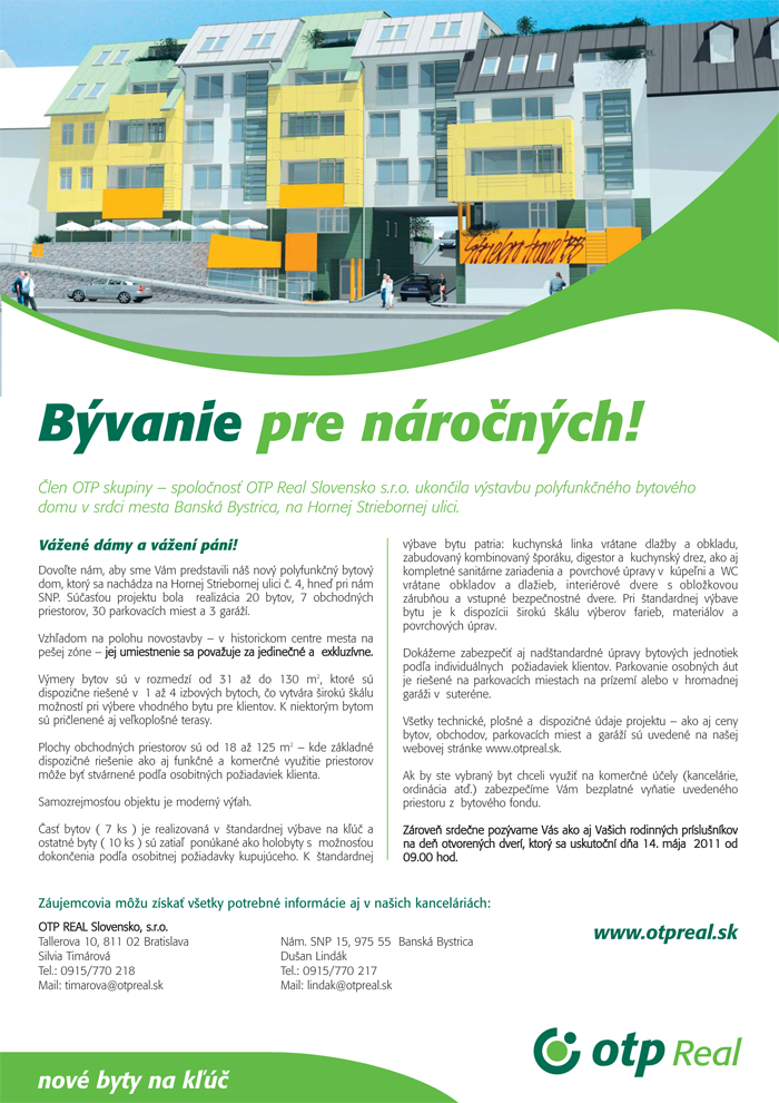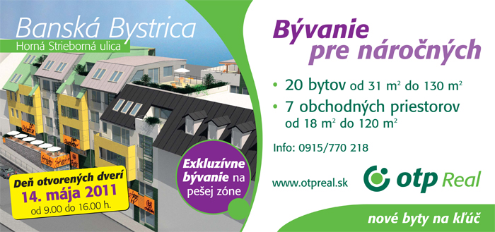 Spoločnosť OTP Real Slovensko s.r.o. ukončila výstavbu polyfunkčného bytového domu v centre mesta Banská Bystrica, na Hornej Striebornej ulici. Priestory objektu a nové byty si môžete prezrieť osobne počas Dňa otvorených dverí, ktorý bude už v sobotu, 14. mája v čase od 9:00 do 16:00 hod.!