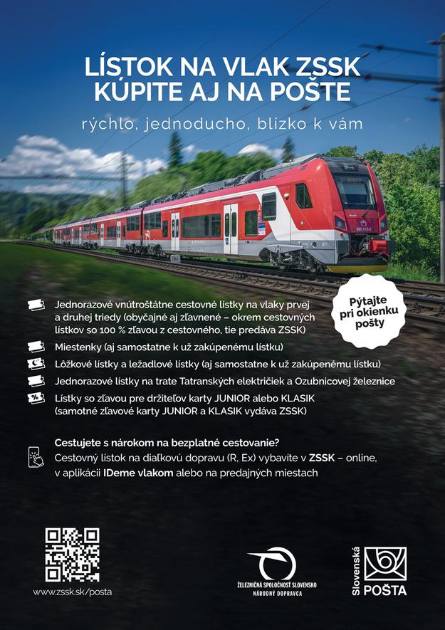 Od októbra 2025 je možné zakúpiť si cestovné lístky Železničnej spoločnosti Slovensko (ZSSK) aj v kamenných pobočkách Slovenskej pošty. Výhody služby, ktorá je praktickým doplnením pokladníc a digitálnych predajných kanálov ZSSK, objavuje čoraz viac cestujúcich.