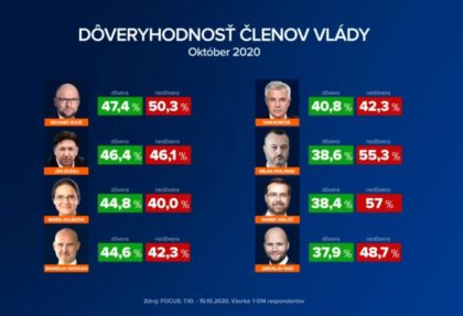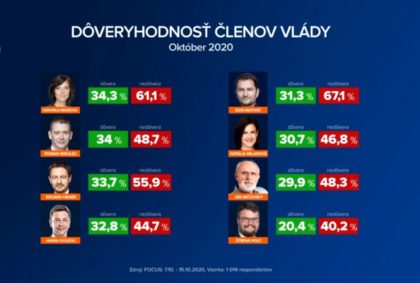Agentúra FOCUS uskutočnila pre TV Markíza na vzorke 1 014 respondentov od 7. do 15. októbra 2020 prieskum dôveryhodnosti predstaviteľov súčasnej vlády Igora Matoviča. Je zaujímavé, že ani jeden z nich vrátane predsedu nemá aktuálne vyššiu dôveru ako 50 percent.