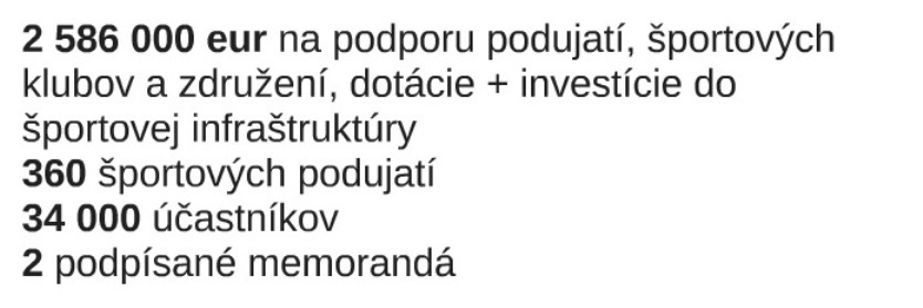 Išlo o memorandá s Vojenským športovým centrom Dukla Banská Bystrica a so Slovenskou asociáciou zrakovo postihnutých.Suma 2 586 000 eur išla na  podporau podujatí, ŠK a združení + dotácie 998 000 eur. Zvyšok tvorili investície do športovej infraštruktúry (najvýznamnejšie položky telocvičňa Magurská 200 000 eur, areály ZŠ 246 800 eur, korčuliarska dráha 293 000 eur…).