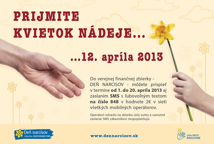 Prispieť môžete tak, ako každý rok, aj prostredníctvom vašich mobilných telefónov zaslaním ľubovoľnej SMS na číslo 848 v hodnote 2 eurá v sieti všetkých mobilných operátorov do 20.4. 2013. Operátori prevedú na zbierku plnú sumu a SMS zasielateľovi nespoplatňujú. Informácie o Dni narcisov nájdete aj na www.dennarcisov.sk.