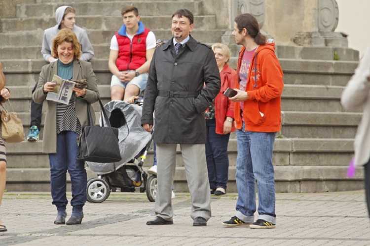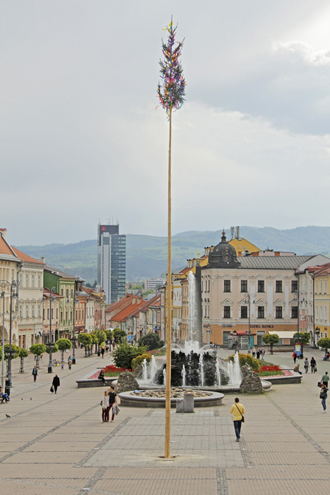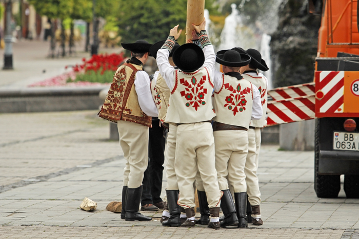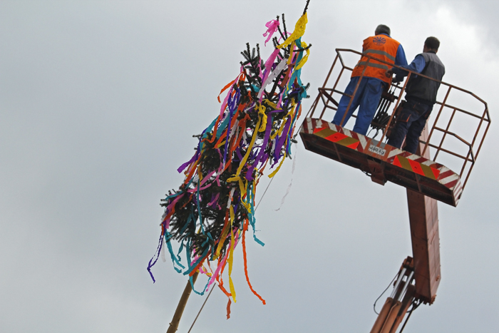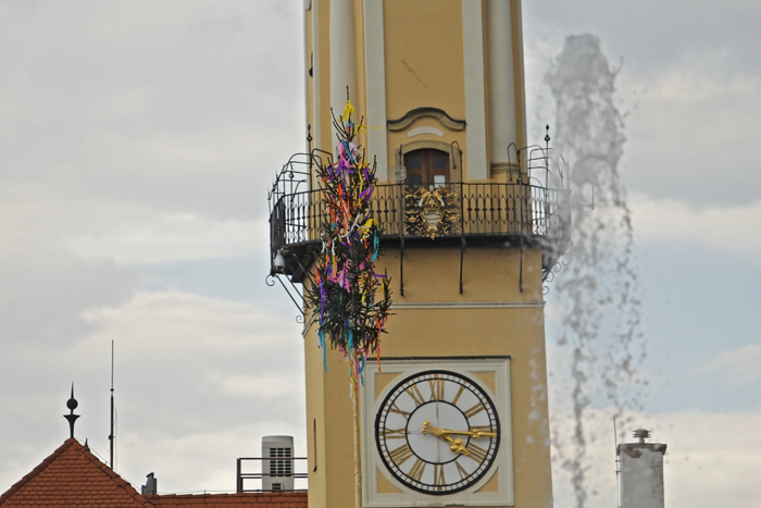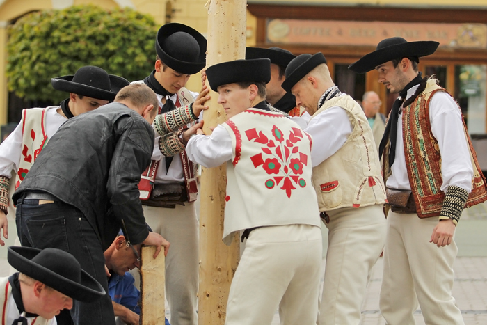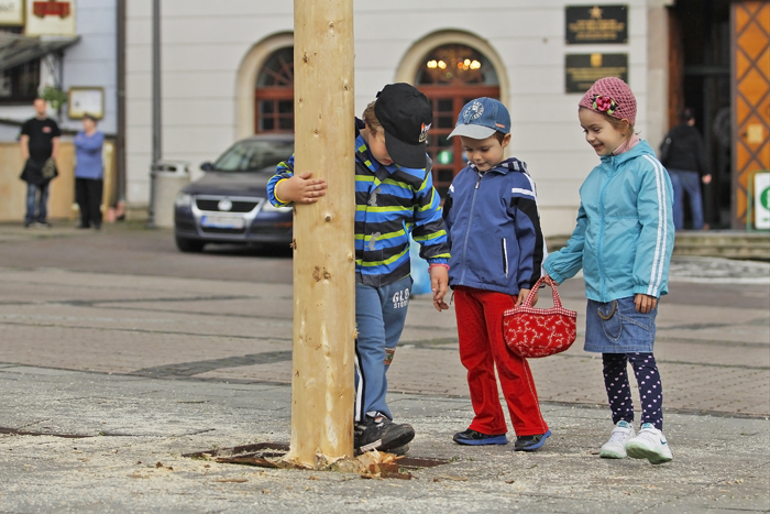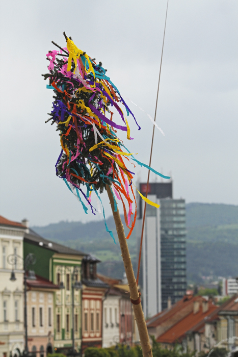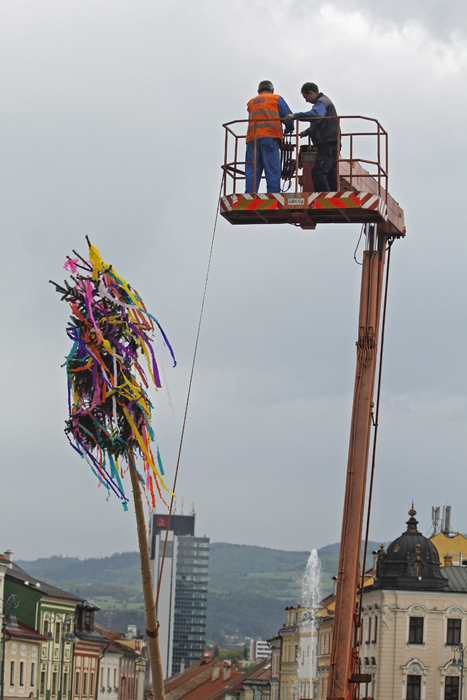 V stredu sa sľubované „tradičné stavanie mája na rozkvitnutom námestí“ zaobišlo bez záujmu verejnosti. Zopár chlapov v krojoch za asistencie techniky PROGRES-HL postavilo máj za zvukov hudby huslistov a spevu sympatických ľudových tanečníc. Pri soche Panny Márie postával primátor Peter Gogola a asi 7 náhodných okoloidúcich.