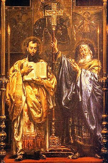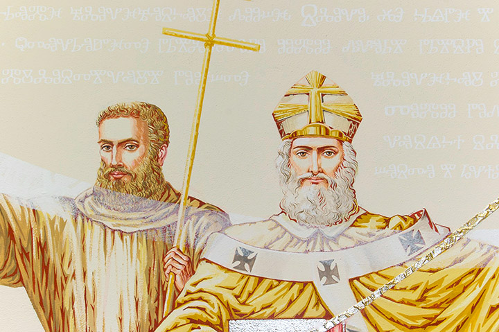 Cyril-Konštantín, pre svoju vzdelanosť prezývaný aj Filozof a jeho brat Metod – právnik, boli byzantskí intelektuáli, ktorých cisár Michal III. vyslal na žiadosť kniežaťa Rastislava, aby šírili kresťanstvo, vytvorili liturgiu a učili v reči zrozumiteľnej ľudu. Ich poslanie bolo duchovné, christianizačné, aj kultúrno-spoločenské.