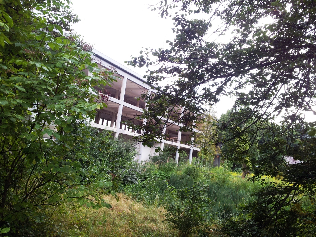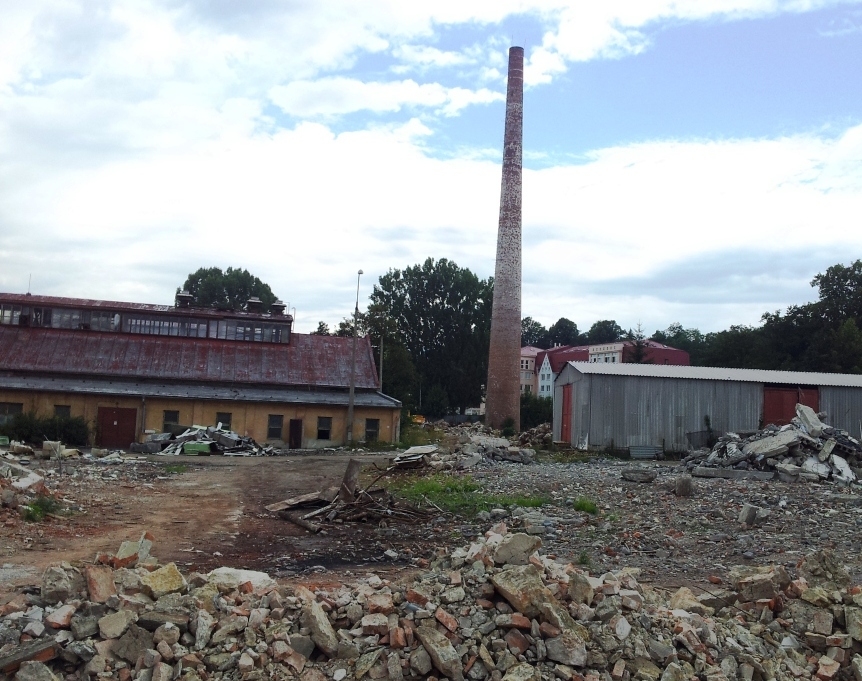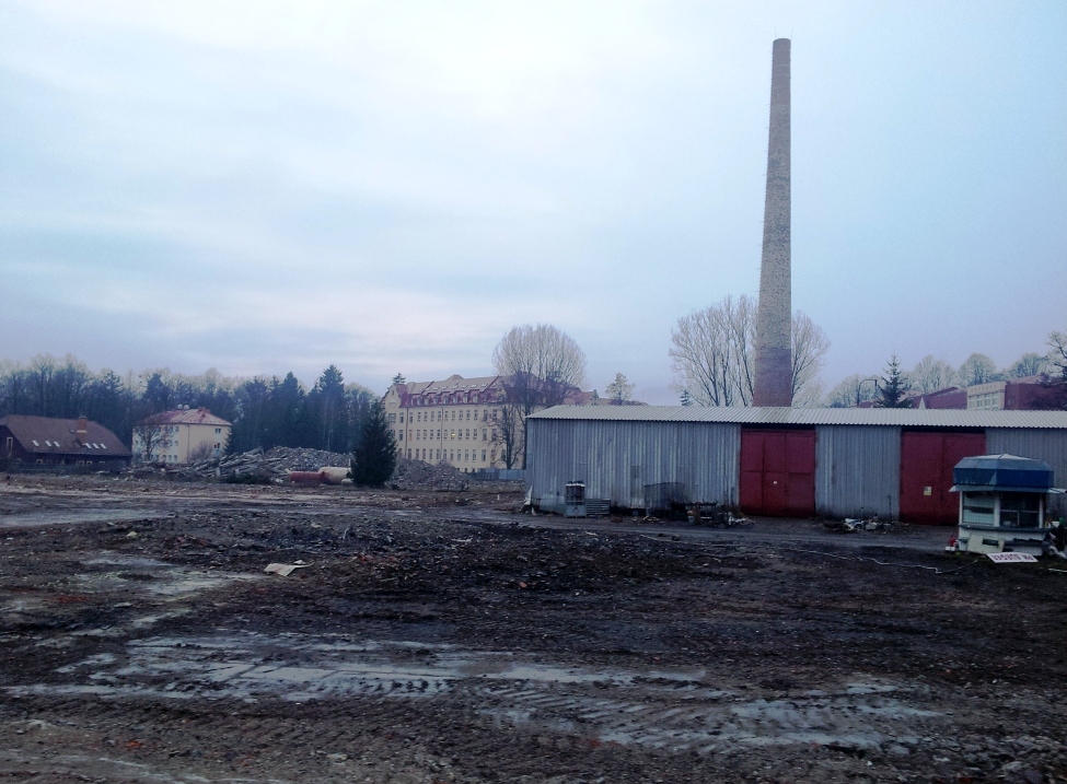 Celá zadná časť areálu Slovensky je už zrovnaná zo zemou. Stavebné sutiny už odviezli na skládku. Zostal tu len starý komín textilky, ktorý zostane zakomponovaný v projekte nového komplexu ako vyhliadková veža. Pamätníci by to tu už nepoznali…