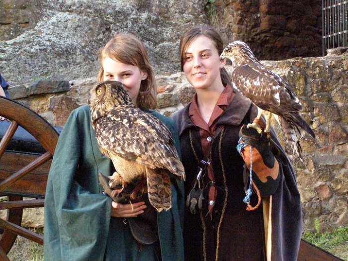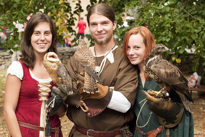 Členovia sokoliarskej skupiny BIATEC so svojími operenými priateľmi na Radvanskom jarmoku v Banskej Bystrici.