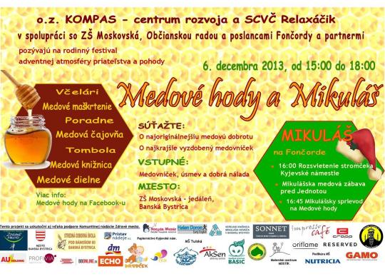 Po jablkových a muffinkových to budú do tretice nové „Medové hody“. Najskôr sa všetci stretnú od 16:00 hod na Kyjevskom námestí, kde Mikuláš rozsvieti vianočný stromček, bude tu hudba a sladkosti. O 16:45 sa návštevníci spolu s Mikulášom môžete presunúť na Medové hody do ZŠ Moskovská.