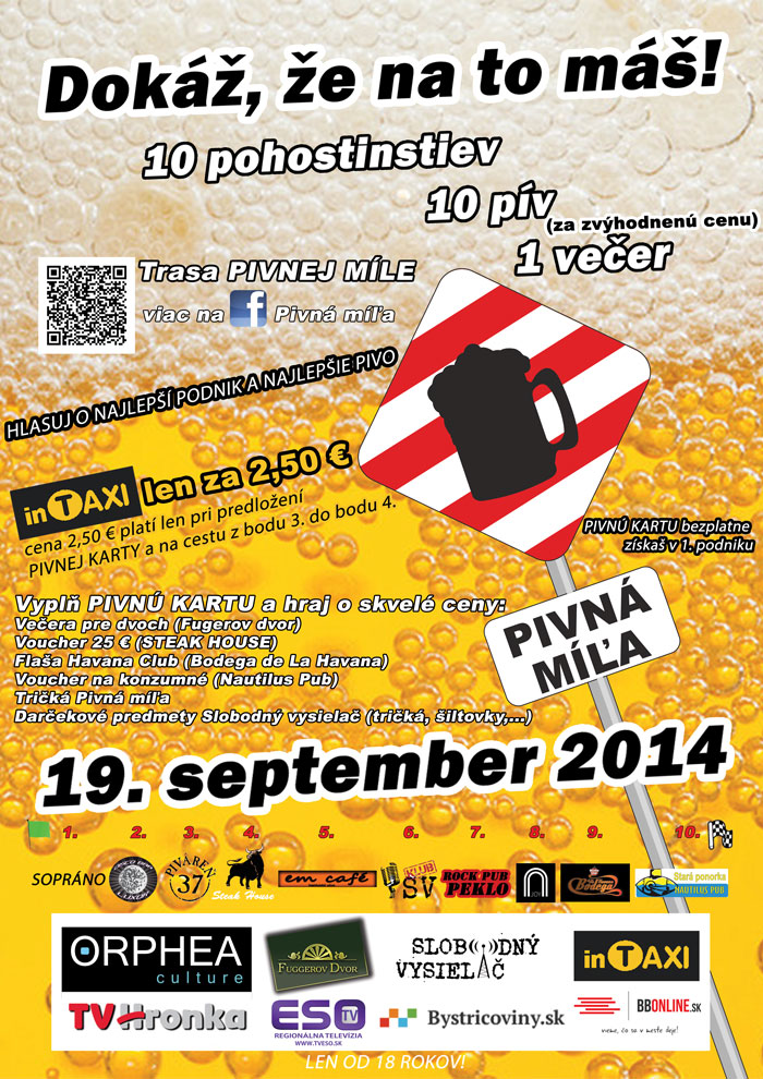 Dokáž, že na to máš! Jeden večer, 10 pohostinstiev, 10 pív. Zvládni to v piatok 19. septembra od 17:00 do 24:00, vyplň pivnú kartu, zahlasuj za najlepší podnik a najlepšie pivo, vhoď vyplnenú kartu do urny v poslednom podniku a môžeš získať skvelé ceny.