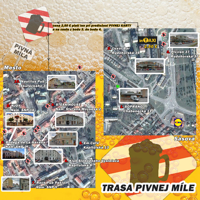 Po zdolaní 3.tieho podniku na Pivnej míli majú účastníci možnosť využiť pivnú kartu aj na presun zo sídliska Sásová k najbližšiemu podniku v poradí ktorý sa nachádza v meste. Postará sa o to IN TAXI za najlacnejšiu cenu v BB 2,50 € stačí sa preukázať Pivnou kartou (cena platí na jednu jazdu z posledného pohostinstva v Sásovej k najbližšiemu v poradí na Námestí SNP). Posledným podnikom je Nautilus Pub kde bude umiestnená urna do ktorej vhodíte vyplnenú Pivnú kartu t.j. meno, priezvisko, tel. číslo, najlepší podnik a takisto aj najlepšie pivo.