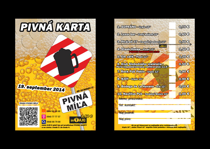 PIVNÁ KARTA obsahuje QR kód, po jeho načítaní smartfónom sa zjaví mapka Pivnej míle, v prípade akýchkoľvek otázok počas večera (19. septembra) bude možné pridávať komentáre priamo k tejto mapke, odpoveď dostanete v čo najkratšom čase.