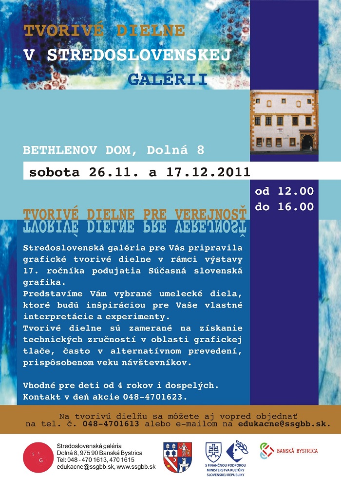 Stredoslovenská galéria pripravila v Bethlenovom dome na Dolnej ulici pre školy všetkých stupňov ale i širokú verejnosť grafické tvorivé dielne, ktoré budú prebiehať v rámci výstavy 17. ročníka podujatia Súčasná slovenská grafika.