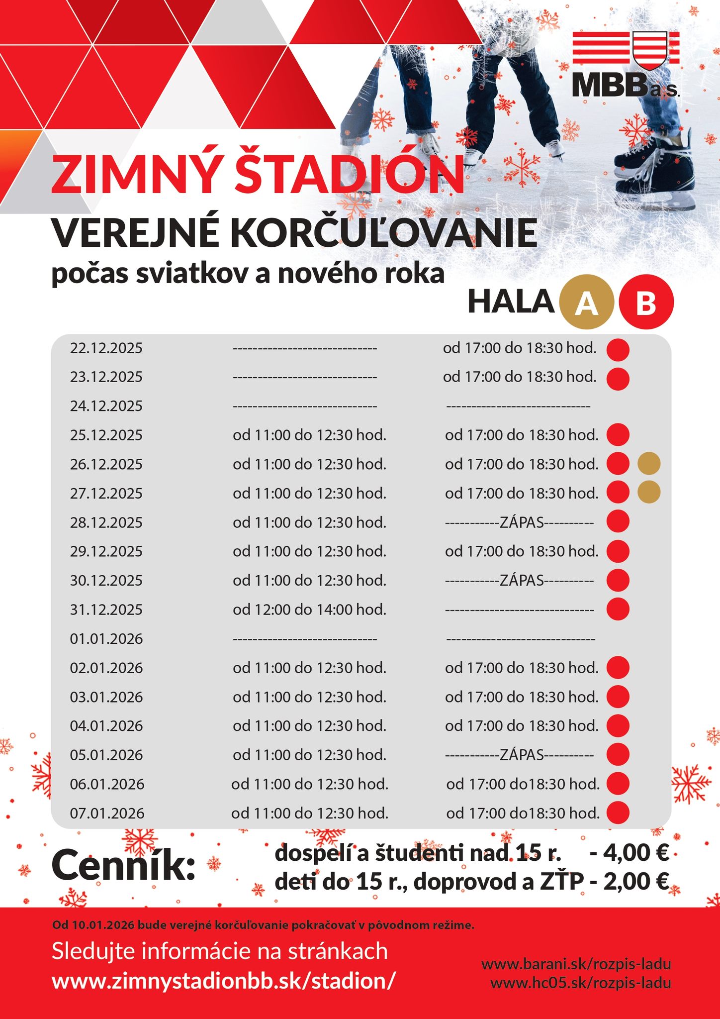 Za zimným dobrodružstvom nemusíte chodiť počas blížiacich sa sviatkov ďaleko. Ľadová plocha na zimnom štadióne je pre korčuliarov k dispozícii od pondelka 22. decembra 2025 až do 7. januára 2026 takmer každý deň, dopoludnia aj popoludní. Príďte si užiť pohyb a sviatočnú atmosféru na ľade s rodinou či priateľmi.