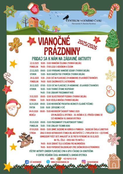 Cez vianočné prázdniny sa o zábavu pre malých aj veľkých postará CVČ Havranské. Čakajú na vás tvorivé dielne, športové aktivity, astronómia, kvízy, jazdenie na poníkoch a veľa ďalších aktivít.