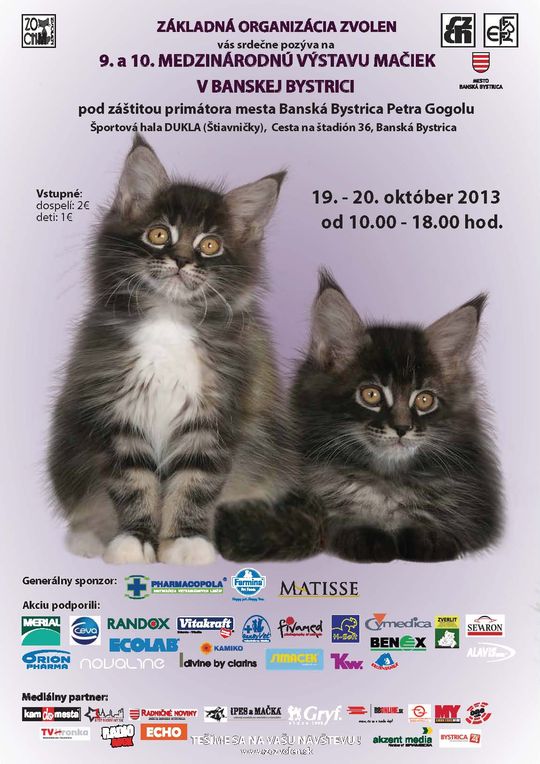 Mesto Banská Bystrica bude v dňoch 19.-20.októbra 2013 hostiť účastníkov 9.-10. Medzinárodnej výstavy mačiek. Tá sa uskutoční v športovej hale DUKLA na Štiavničkách.