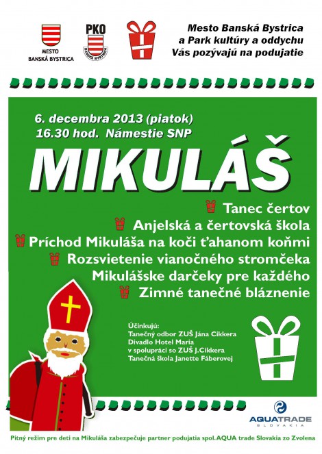 Námestie SNP v Banskej Bystrici sa v piatok 6. decembra o 16:30 hod. rozžiari mikulášskym programom. Úvodný čertíkovský tanec bude patriť deťom z tanečného odboru Základnej umeleckej školy. Diváci uvidia, ako to asi vyzerá v anjelskej a čertovskej škole, príde Mikuláš na koči ťahanom koňmi. Naučí dobrému správaniu čertov aj anjelov a možno aj divákov.