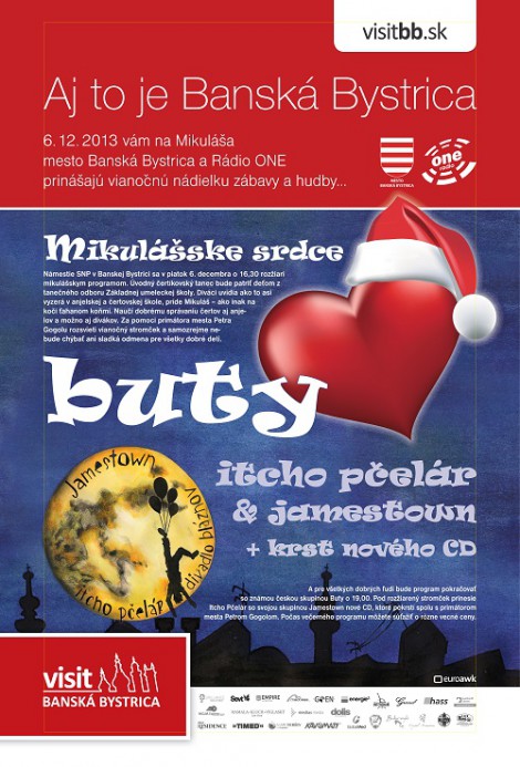 Pre všetkých dobrých ľudí bude program pokračovať so známou českou skupinou Buty o 19:00 hod. Pod rozžiarený stromček prinesie Itcho Pčelár so svojou skupinou Jamestown nové CD, ktoré pokrstí spolu s primátorom mesta. Počas večerného programu môžete súťažiť o rôzne vecné ceny.