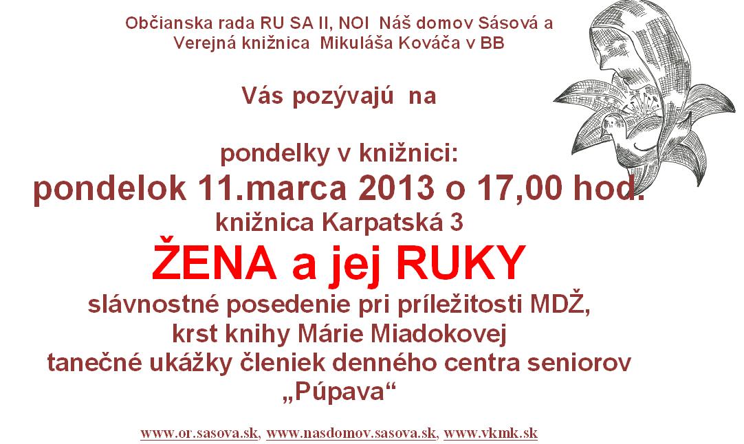 V pondelok 11.8.2013 o 17:00 hodine sa vo Verejnej knižnici M.Kováča na Karpatskej 3 uskutoční slávnostné posedenie „Žena a jej ruky“ pri príležitosti MDŽ. Svoje tanečné ukážky predvedú členky denného centra seniorov „Púpava“. Pôjde o country tanec Amazonky a môžete si pozrieť aj výstavku ručných prác.