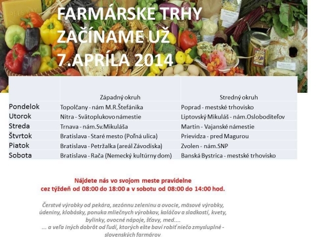 Okrem Banskej Bystrice sa farmárske konajú aj vo Zvolene, Prievidzi , Martine, Liptovskom Mikuláši, Poprade, v Topoľčanoch, Nitre, Trnave a Bratislave. Ich cieľom je podpora rodinných fariem a trhu s domácimi výrobkami. Jarný farmársky trh s Otváraním Bánoša sa uskutoční v areáli Strednej odbornej školy Pod Bánošom v Banskej Bystrici v sobotu 26.apríla 2014.
