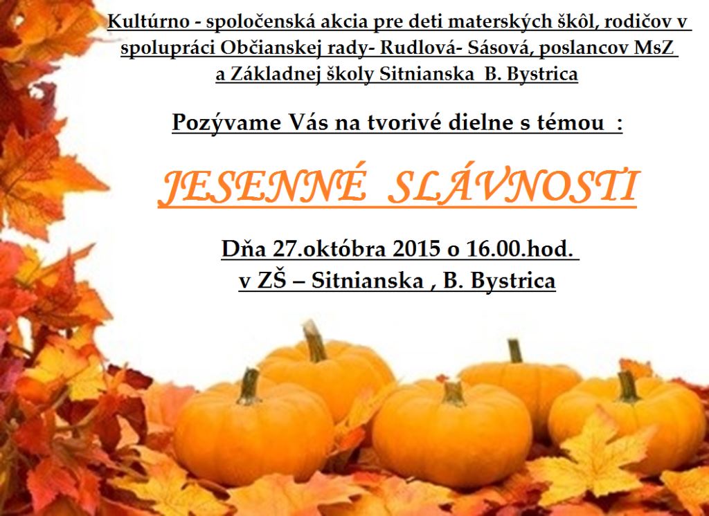 Banskobystrická jeseň sa v sásovskej ZŠ Sitnianska stala tradičným priestorom na oslavu tohto farebného ročného obdobia. Na najväčšom banskobystrickom sa v utorok 27.októbra o 16:00 hod. uskutoční 7. ročník Jesenných slávností sásovských materských škôl.