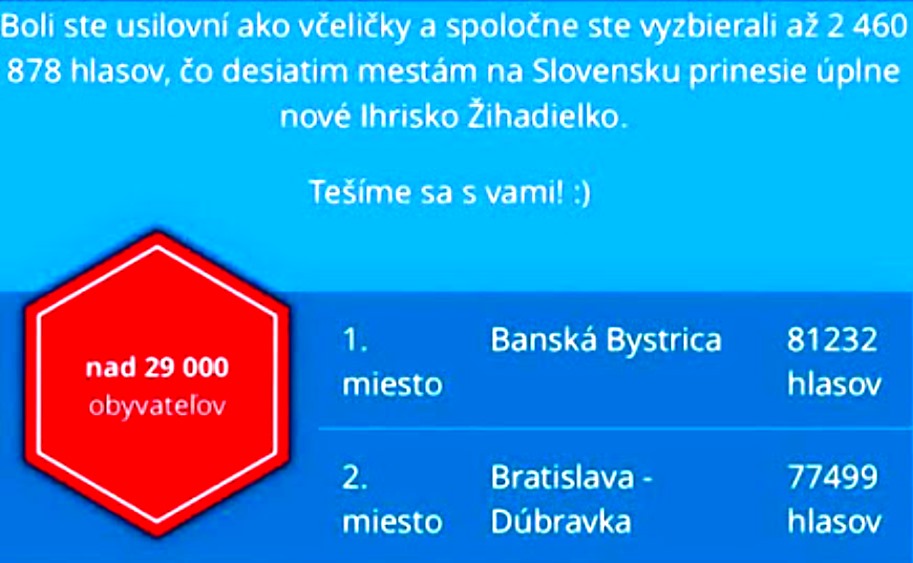 Projekt spoločnosti LIDL poskytne desiatim víťazným mestám výstavbu detských ihrísk, tzv. Žihadielok. V každej kategórii získajú nové detské ihrisko dve mestá s najvyšším počtom hlasov. Banská Bystrica bola zaradená medzi mestá nad 29.000 obyvateľov. Podľa zverejnených výsledkov vyhrali vďaka 81.232 hlasom pred Bratislavou – Dúbravkou so 77.499 hlasmi. Ďakujeme všetkým Bystričanom za odovzdaný hlas!