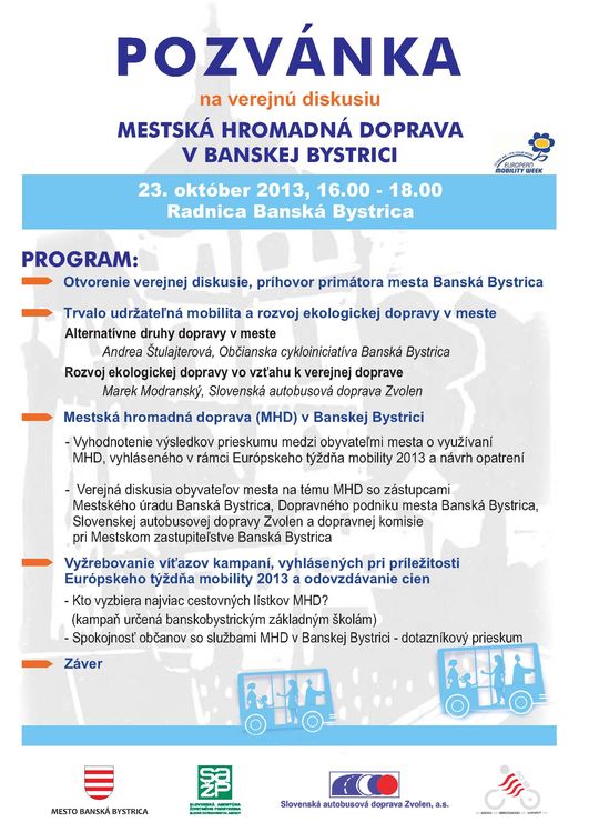 V rámci otvorenej diskusie sa prítomní občania budú môcť vyjadriť ku kvalite MHD v našom meste a komunikovať so zástupcami MsÚ, Dopravného podniku mesta Banská Bystrica, SAD Zvolen a predsedom  dopravnej komisie pri mestskom zastupiteľstve.