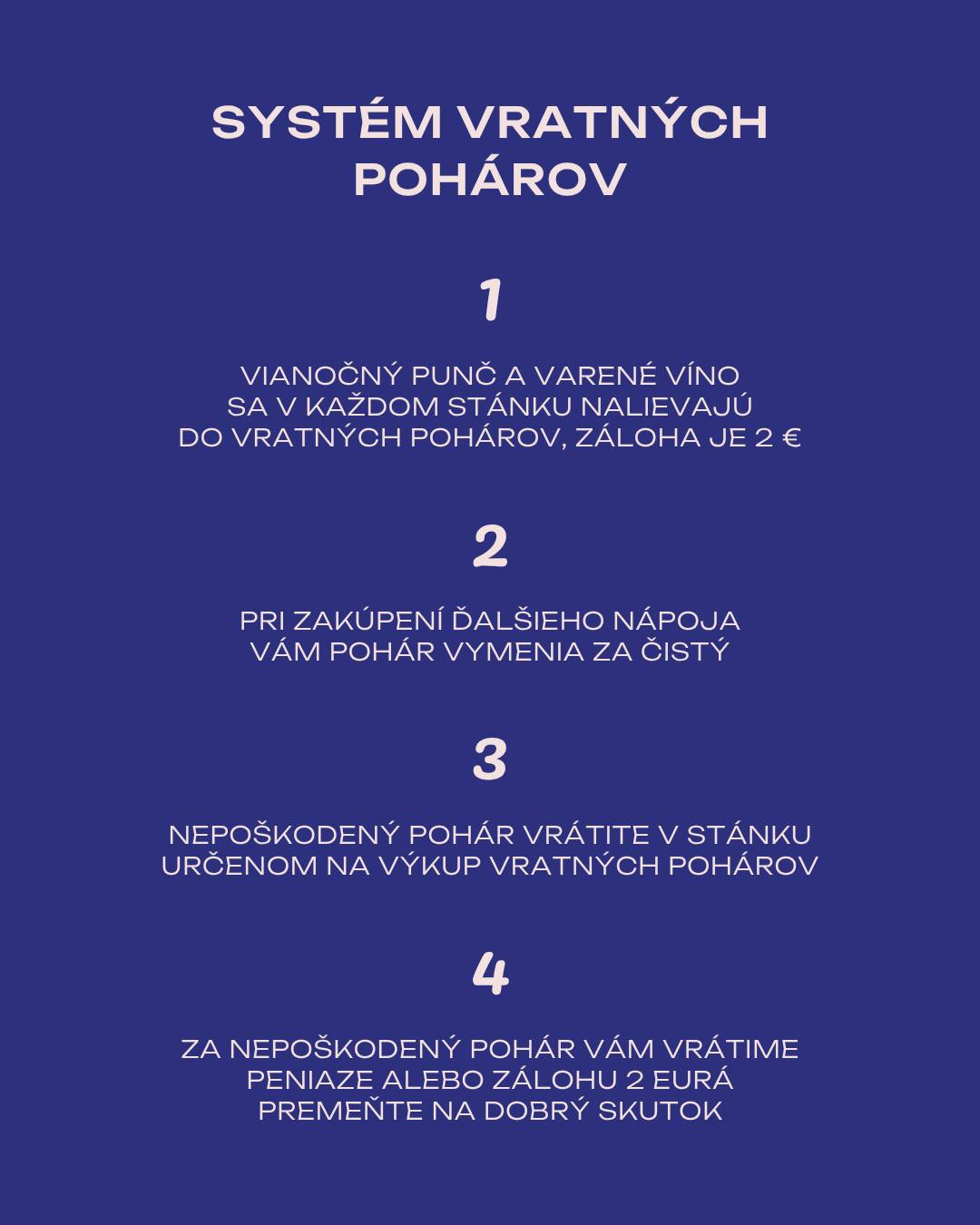 - Pohár si prevezmete pri kúpe prvého nápoja (vianočného punču či vareného vína) v každom stánku – záloha je 2 €.